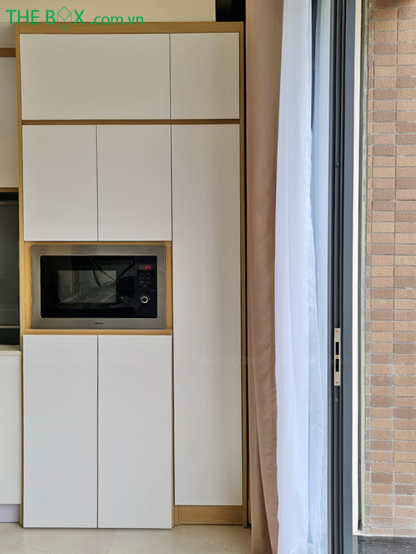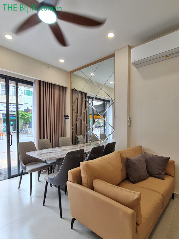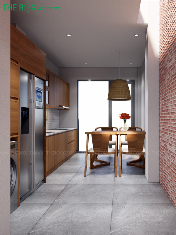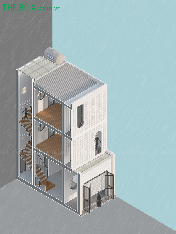Vì là nhà nhỏ, lại chứa nhiều công năng. Nên việc thoát mùi đa phần là xử lý bằng quạt hút, máy hút mùi. Dẫn mùi vào hệ thống hộp kỹ thuật và đưa lên mái.