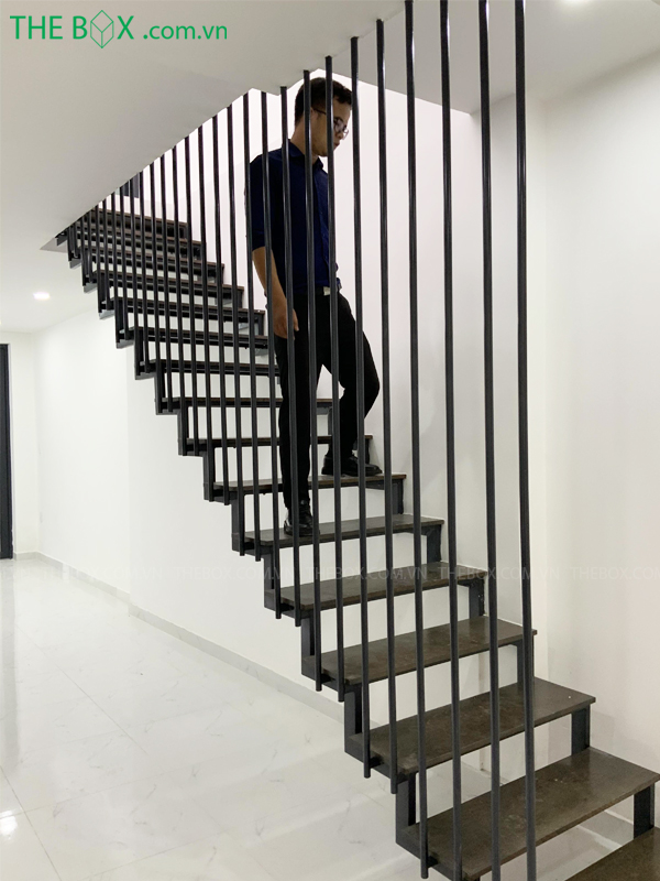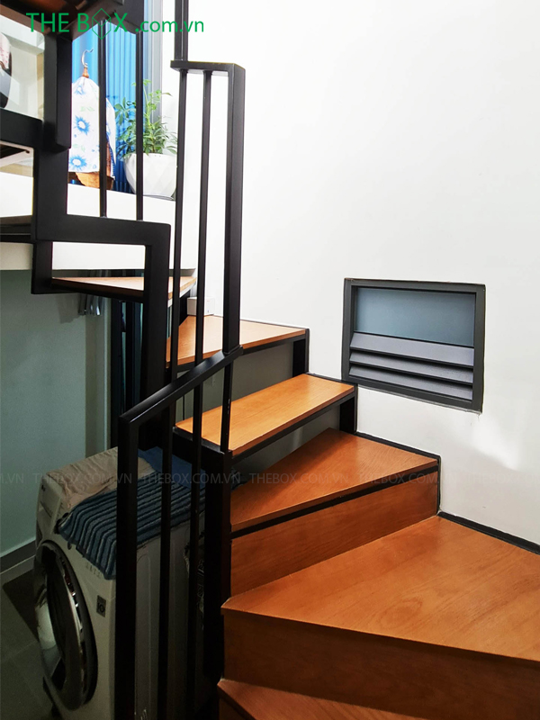 Có thể sử dụng cầu thang sắt bậc gỗ, lan can kính,… Giải pháp đáp ứng thời gian thi công nhanh mà cũng rất thẩm mỹ.