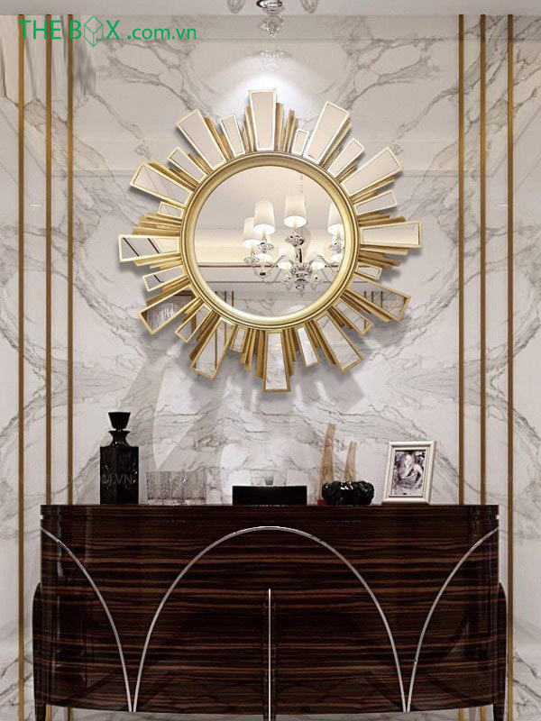Những chiếc gương với khung viền vàng bên ngoài, những khung hình tỏa ra từ gương như mặt trời, chắc chắn sẽ khiến không gian thêm hoàn hảo.