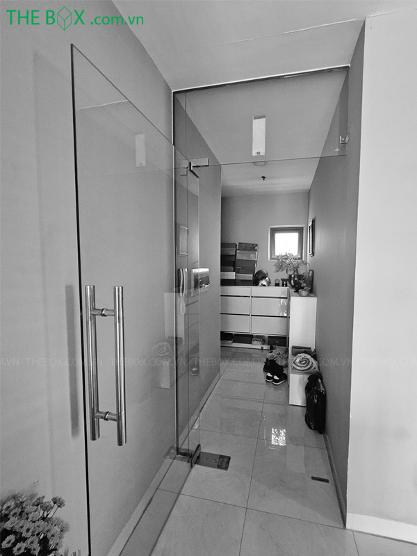 – Một chi tiết cũng phải kể đến là hệ cửa trượt âm slim ray trên. Hệ cửa này có tác dụng về mặt kiến trúc, thẩm mỹ. Đồng thời đáp ứng nhu cầu về hướng của căn hộ, không gian bật điều hòa cho phòng khách và sự trang trọng cần có cho khu vực sảnh chờ.