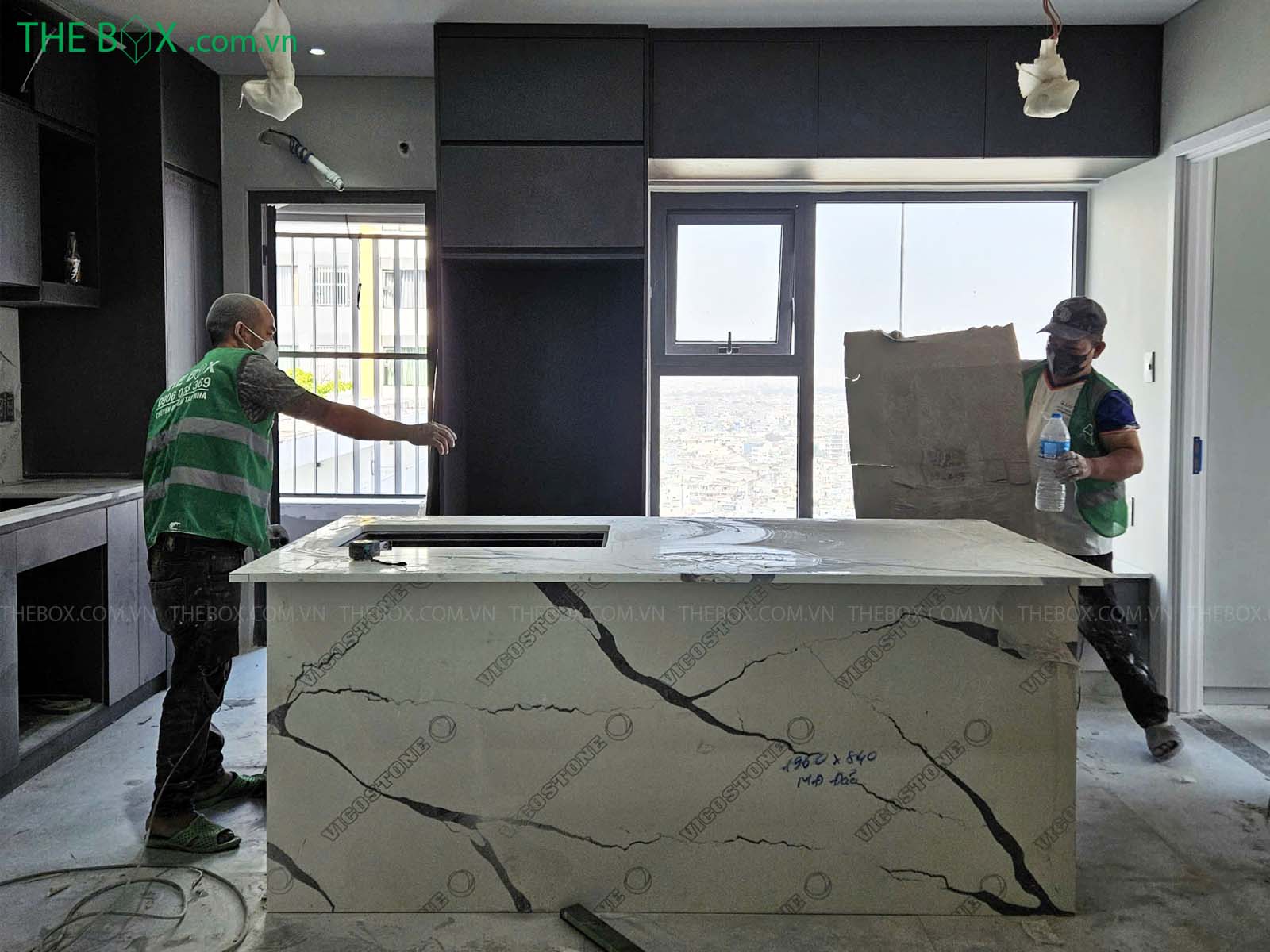 – Vật liệu sử dụng thuộc dạng cao cấp như: đá vicostone nhóm E, đèn treo & âm tường, hệ thống điện Schneider, gỗ An Cường cùng gạch lót nền vân đá xám 800×800,…