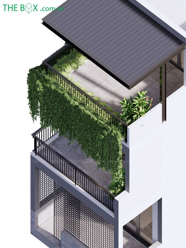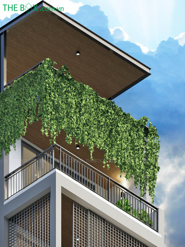 – Giải pháp mặt tiền được The Box đặc biệt chú trọng. Khoảng vươn dài của mái sân thượng tạo cho căn nhà cảm giác nhẹ nhàng – bớt khô cứng. Kiến trúc hiện đại này còn được sử dụng ở mô típ cổng chính – hoa sắt bảo vệ, hệ thống gỗ panel ốp mái, giàn cây rũ,…