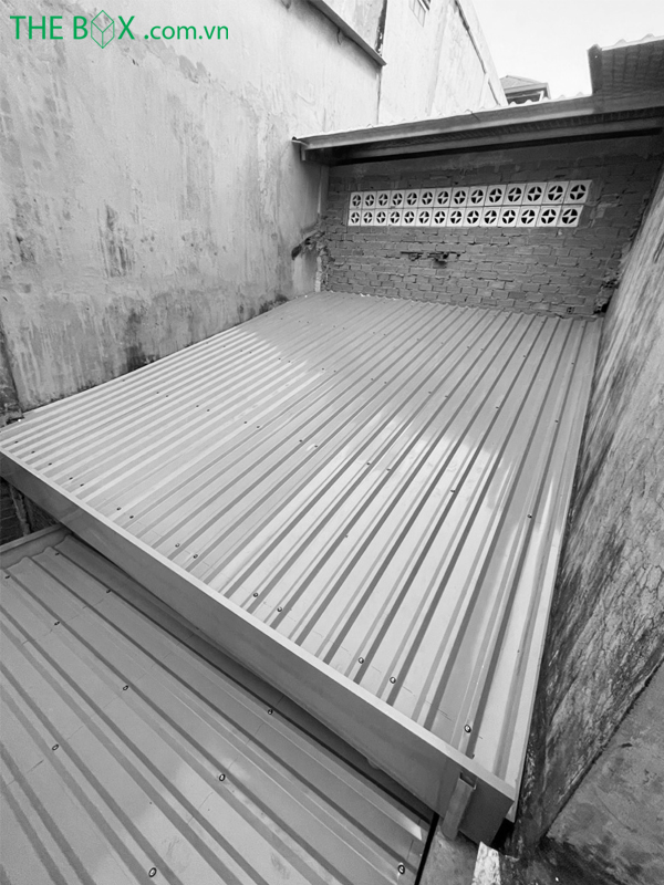 – Khoảng sân trước được bố trí lại làm nơi để xe và có mái kính phía trên.