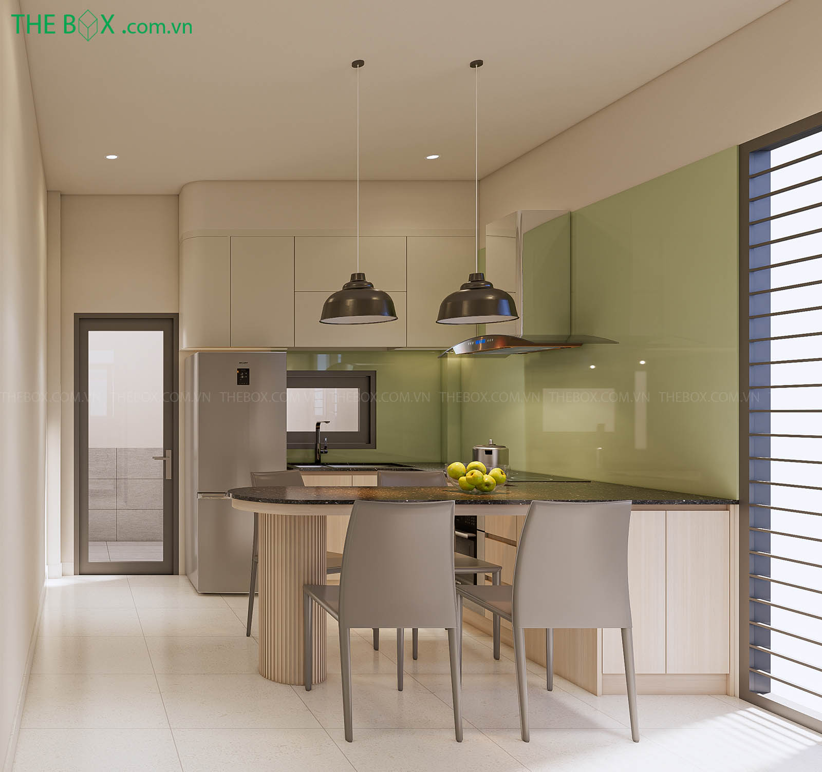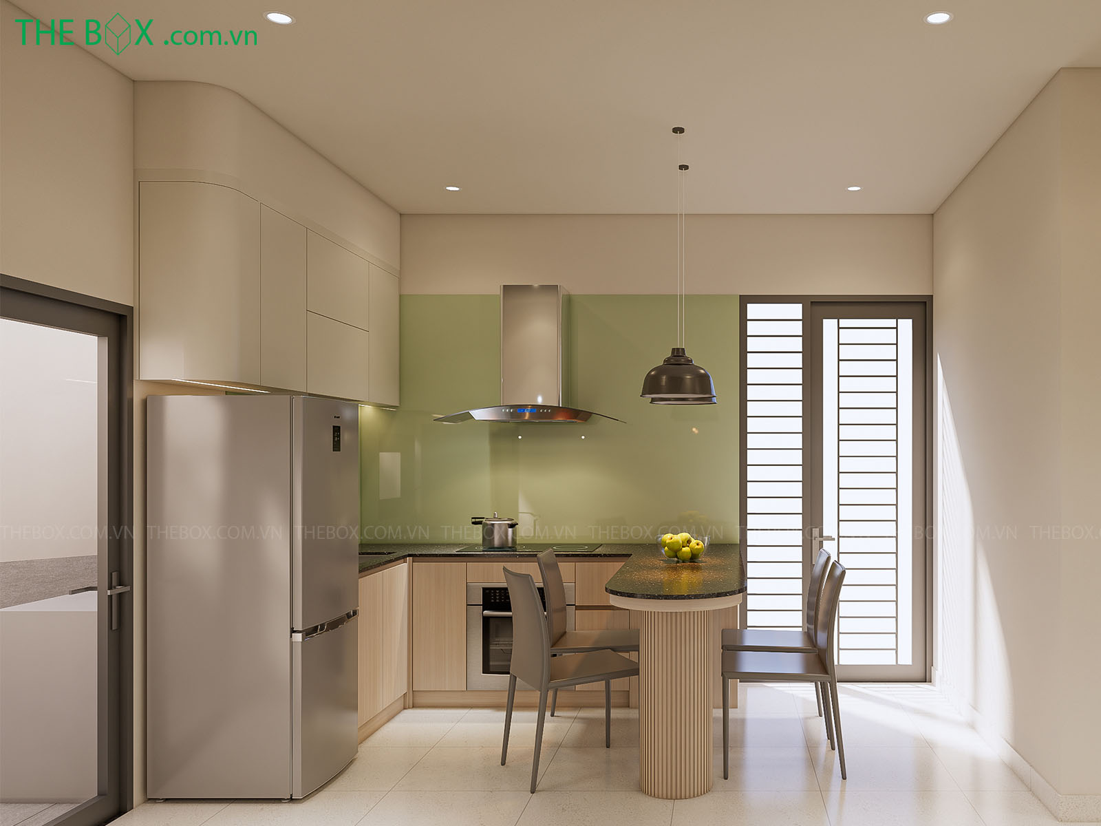 – Thiết kế lại khu vực bếp tầng trệt. Tủ bếp có cấu trúc chữ L – liên hoàn với bàn ăn dạng đảo bếp để tiết kiệm không gian. Không gian bếp ăn tách biệt với phòng khách và cầu thang bằng cửa kính, hạn chế ám mùi khi nấu nướng.