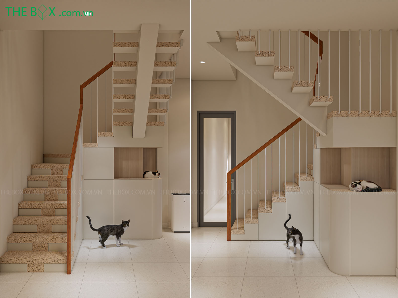 – Khu vực cầu thang được thiết kế lại với hệ tủ âm và không gian sống cho mèo