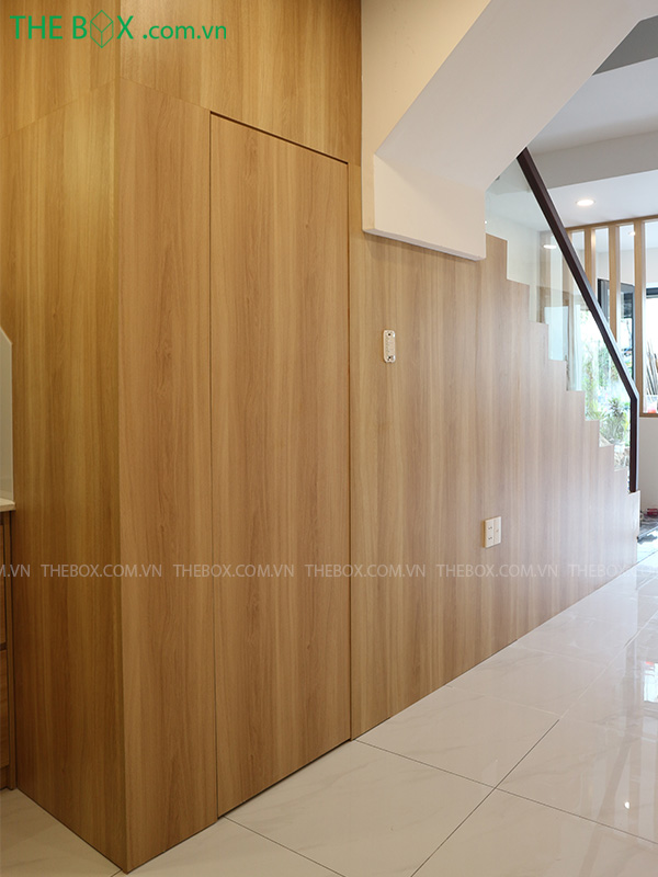 – Để không tác động vào mảng tường gạch ốp viền xung quanh nhà ở khu vực tầng trệt, The Box đề xuất giải pháp ốp hệ lam nhựa trang trí đồng màu cùng với ván gỗ công nghiệp sử dụng trong nội thất. Thiết kế nhờ đó có tính tổng hòa và hợp lý hơn.
