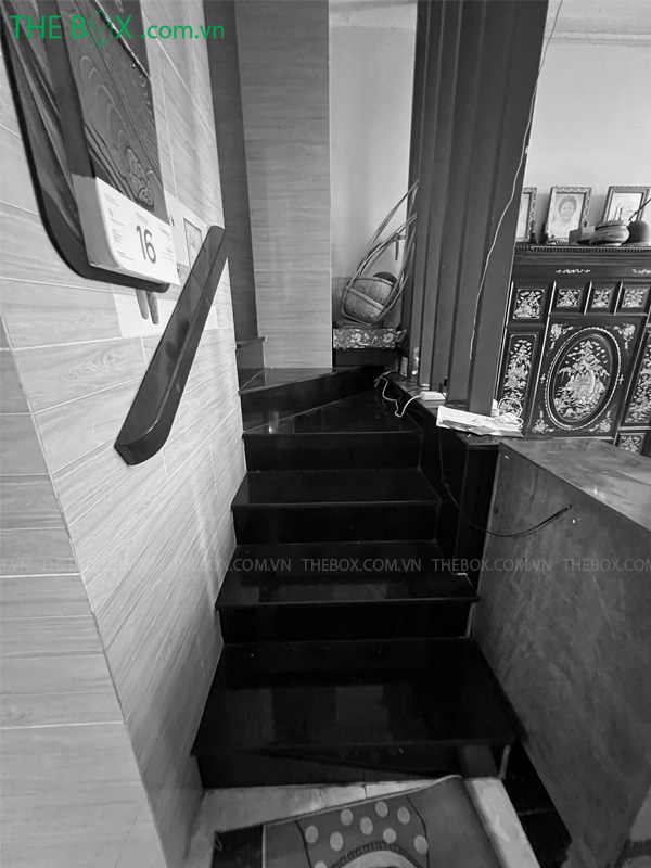– Giữ lại phần lớn cầu thang hiện hữu, thay đổi hướng tiếp cận cầu thang. Giải pháp này giải phóng không gian tầng trệt. Phía trước cầu thang bố trí bức vách ngăn nhẹ, nơi đặt bàn thờ ông Địa của gia chủ