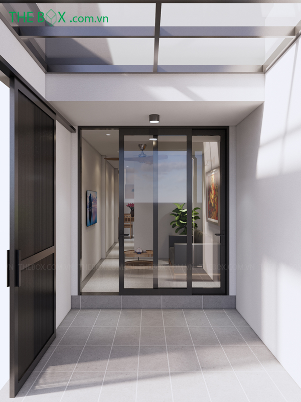 – Thiết kế cổng trượt giúp giảm diện tích khu vực để xe, đồng thời lắp đặt mái kính phía trên để lấy sáng cho các không gian chức năng phía trên, bố trí 3 phòng ngủ gồm 1 phòng ngủ tầng trệt và 2 phòng ngủ tầng lửng.