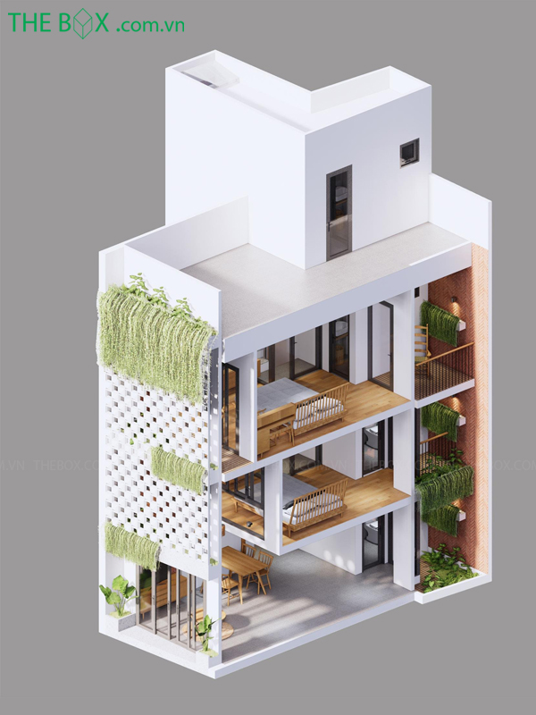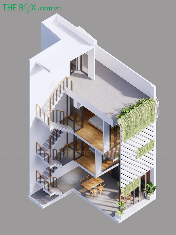 Phương án cải tạo bổ sung thêm các mảng xanh, các khoảng thông tầng lấy gió và ánh sáng vào bên trong căn nhà.