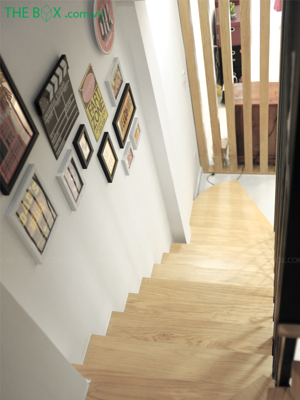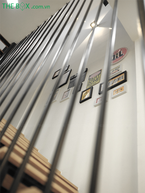 + Giải quyết bài toán về cầu thang, cầu thang được đưa về cuối nhà. Sử dụng vật liệu sắt – gỗ và lan can theo phân vị dọc. Thủ pháp này giúp không gian được nới rộng hơn, đồng thời không bị cảm giác nặng nề hay bức bí