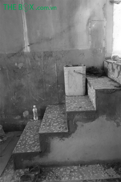 Cầu thang là một phần quan trọng của kết cấu cũ, nên việc tác động cần cân nhắc kỹ lưỡng. Kiến trúc sư quyết định giữ lại 1 vế cầu thang, chuyển vế còn lại và tận dụng khu vực bên dưới làm nhà vệ sinh. Tầng trệt bố trí một phòng ngủ nhỏ cho người già ở phía sau. Không gian phía trước thang sẽ rộng hơn, bao gồm phòng khách, bếp – ăn. Cầu thang sẽ thành điểm nhấn của không gian sau khi cải tạo, với bậc đầu tiên được kéo dài ra, tạo thành bước đệm trước khi di chuyển lên lầu.