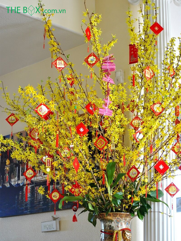 Những loại phụ kiện thường được ưa chuộng phải kể đến như những câu chúc hoặc cặp câu đối. Những túi tiền vàng thường được treo trên những cành mai, cành đào,…